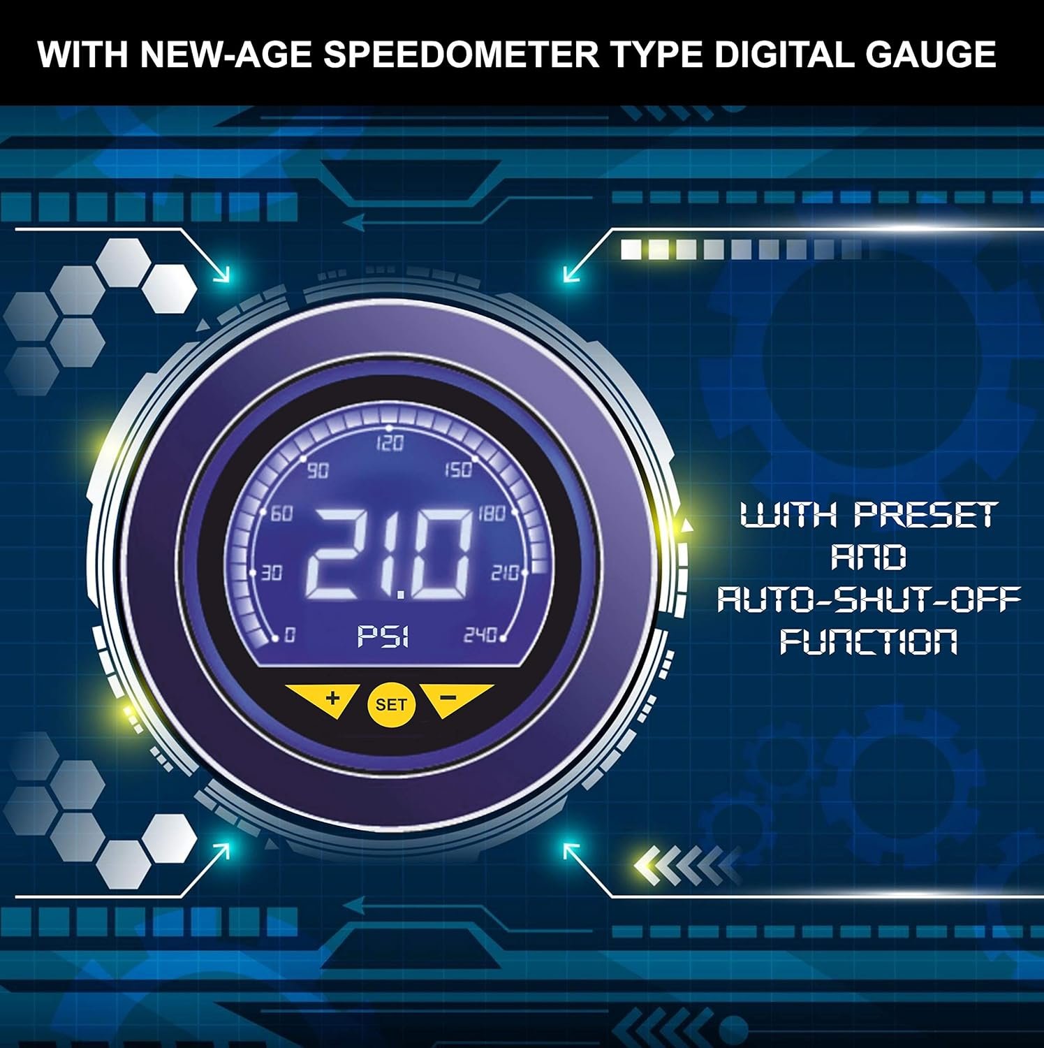 Special Features: Built-in LED, Solid Metal Body, 100% Copper Motor, Digital Gauge with Preset & Auto Shut-Off, Braided Air Hose, Superfast Inflation